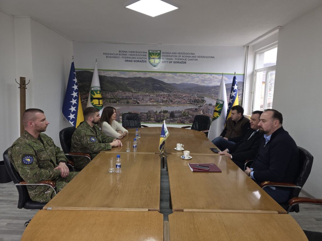 Danas su Gradsku upravu Grada Goražda posjetili pripadnici terenskog ureda Višegrad. EUFOR LOT tima. Gradonačelnik Ernest Imamović i pomoćnici gradonačelnika Sanid Zirak i Muamer Hodžić su upoznali goste o aktuelnim projektima koje realizuje Grad Goražde s fokusom na infrastrukturne projekte.